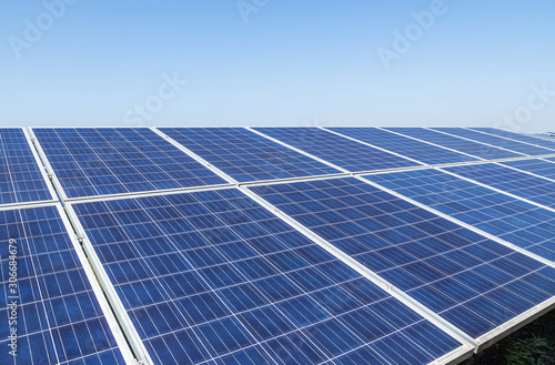 Close up rows array of solar cells or photovoltaics in solar power station convert light energy from the sun into electricity alternative renewable clean energy efficiency from the sun