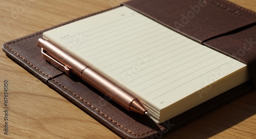 温かい光差し込む革製ノート 上品なローズゴールドペン添え 静寂な書斎風景. AI Generated