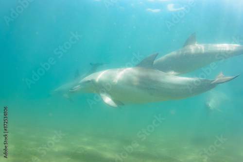 ドルフィンスイムで可愛いミナミハンドウイルカの群れが出迎えてくれた。白い子イルカもいる。 日本国石川県七尾市能登島 - 2017年5月5日。 北陸地方の石川県、能登半島の先端にある能登島(北緯37度07分、東経136度59分)は、ミナミハンドウイルカの地球上の北限の生息地として知られている。 Indian Ocean Bottlenose Dolphin (Tursiops aduncus)