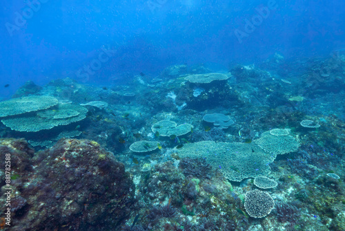 美しいテーブルサンゴとツノダシ(ツノダシ科)、サザナミヤッコ(キンチャクダイ科)、キンギョハナダイ(ハナダイ亜科)、キホシスズメダイ(スズメダイ科)他の群れ 東京都伊豆諸島式根島 - 2021年3月 Zebra angelfish (Pomacanthus semicirculatus) Moorish Idol juvenile (Zanclus cornutus) Sea Goldie