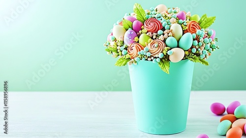 A blue vase holding candies sits atop a table beside a pile of them