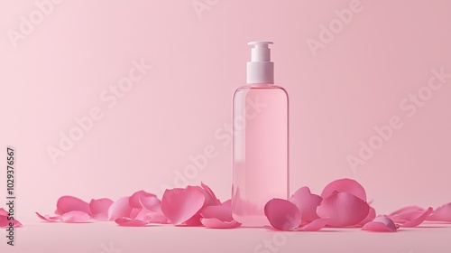 A bottle of lotion sits atop a table, surrounded by pink flowers against a pink backdrop