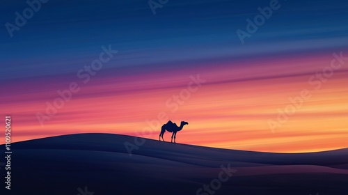 A camel silhouette stands in the desert at sunset against a pink and blue sky