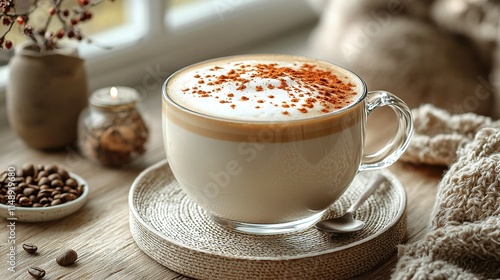 A cappuccino sits atop a saucer beside a bowl of beans and floral vase
