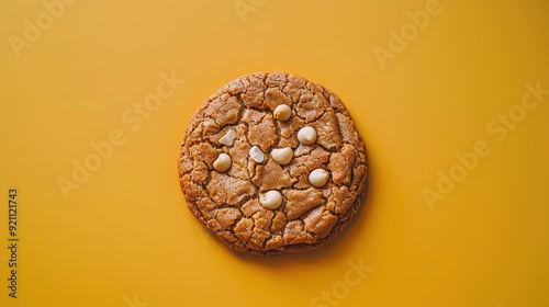 A chocolate chip cookie with white chocolate chips on a yellow background with a bite taken out of one of the cookies