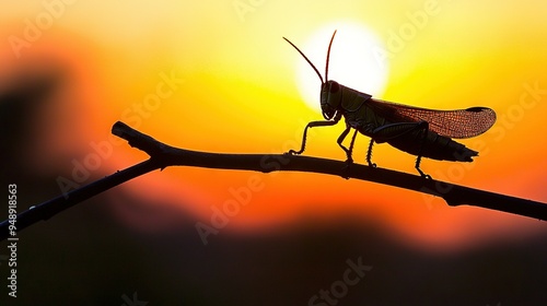 A close-up of a grasshopper on a tree branch with the sun shining behind it, and a blurred sky as the backdrop