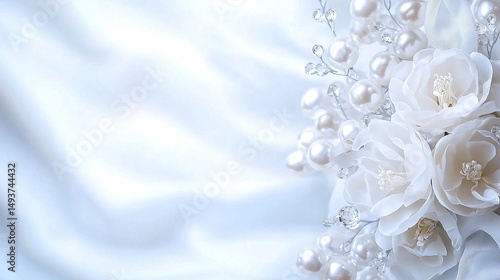 A close-up of a white satin background with a bouquet of flowers and pearls on either side