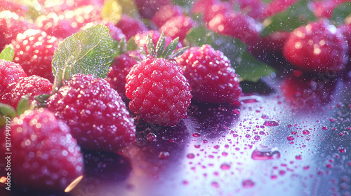 A macro shot of several juicy raspberries, with tiny water droplets on the surface of the glass and the surrounding ground