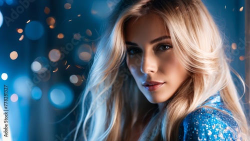 A stunning blonde woman in a blue dress poses before a blue backdrop adorned with sparks
