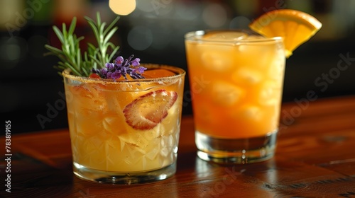 A tight shot of two glassware holding drinks on a table Oranges slices decorate one, while a rosemary sprig graces the other as garnishes