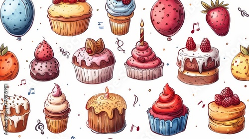 cake, cupcake, dessert, chocolate, sweet, food, muffin, birthday, cream, candy, illustration, cherry, pattern, bakery, set, cartoon, cup, strawberry, cute, party, icon, decoration, delicious