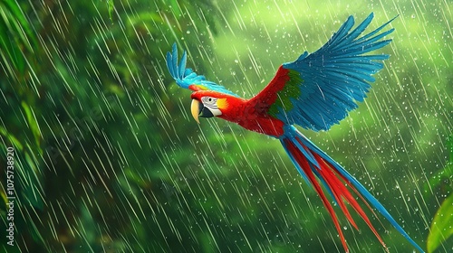 A vibrant bird soars through the rain with its wings spread wide