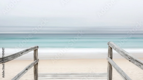 Ocean view from a beach with a wooden gate leading to a sandy shore and blue water in the background