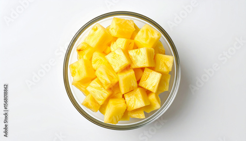 夏にぴったりの爽やかパイン素材 – フレッシュで瑞々しいダイスカットの果肉が輝く俯瞰写真 Refreshing Summer Pineapple – Fresh and Juicy Diced Fruit in a Bright Overhead Photo