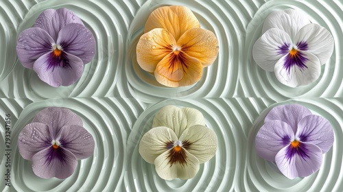 Six pansies of distinct colors are lined up on a white plate with a spiral design as the background