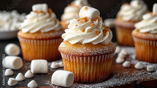 Wooden board featuring cupcakes with white frosting and marshmallows, surrounded by additional cupcakes