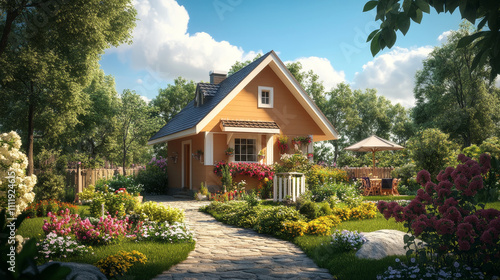 3D rendering and illustration of a home garden exterior, showcasing a beautifully designed patio area. The patio is furnished with comfortable outdoor seating, such as stylish chairs and a table, ide