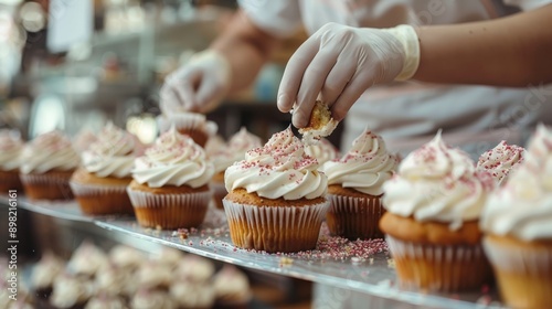 A baker decorates cupcakes on a silver tray with white frosting and sprinkles