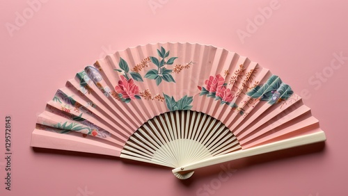 a beautifully crafted fan adorned with floral patterns against a soft pink background