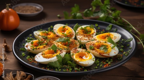 a black plate topped with hard boiled eggs and garnished with herbs and seasoning on top of a wooden table.
