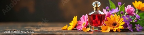 - A bottle of perfume with assorted colorful flowers on a wooden table, arrangement, aromatic