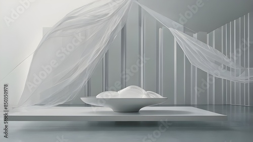 a bowl of food sits on a table with a plastic cover over it white curtains in a room