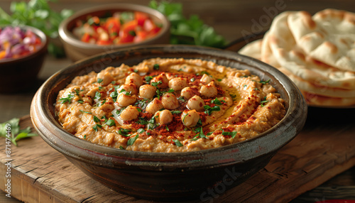 hummus, bowl, vegan, dip, food, snack, healthy, chickpea, cookery, vegetarian, pita, bread, homemade, mediterranean, lebanese, fresh, arabic, background, widener, paste, vegetable, parsley, creamy, oil, lunch, plate, diet, delicious, paprika, middle, eastern, olive, bean, wooden, dipping, traditional, top, meal, pea, table, tasty, closeup, sesame, nourishment, eating, white