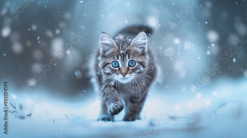 A cat with blue eyes walks through the snow, surrounded by a blurred backdrop of falling snowflakes