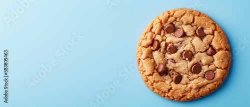 A chocolate chip cookie, tightly focused, against a tranquil blue backdrop, with a single cookie exhibititing a taken bite