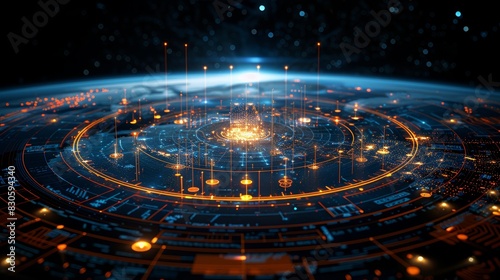 A circular arrangement of lights against a dark backdrop, with a solitary, radiant light situated at the center of the circle