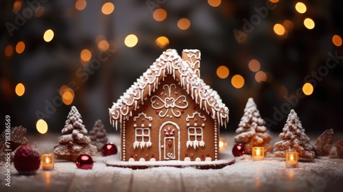a close up of a gingerbread house on a table with a christmas tree in the foreground and lights in the background.