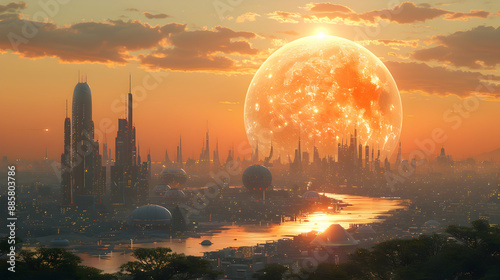 A futuristic solar planet with domed cities and advanced renewable energy sources