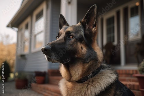 a German Shepherd dog keeping watch in front of a home. protecting the family house.