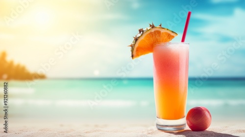 A glass of pink and orange cocktail with a slice of pineapple and a red straw sits on a white sandy beach. The ocean is in the background, with blue water and a clear sky.
