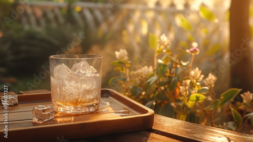 a glass of whiskey sitting on top of a wooden tray next to a glass of ice cubes on top of a wooden tray with a flower garden in the background.