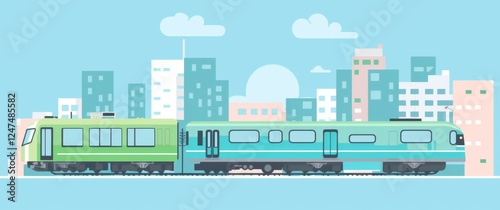 a green and blue train on a city background, featuring simple buildings