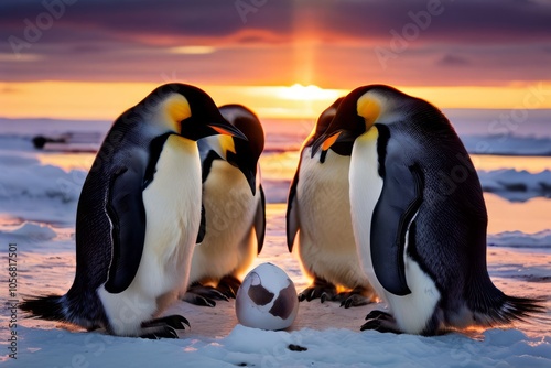 a group of emperor penguins huddle transferring an egg from fee