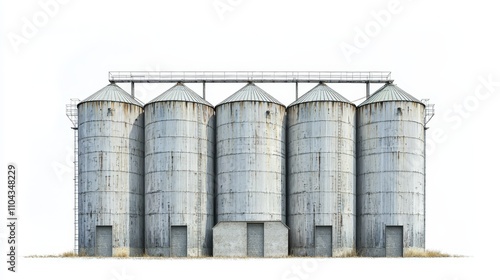 a group of five metal grain bins sitting on top of a grass covered field, with a white background The grain bins are arranged in a neat row, and the grass is visib