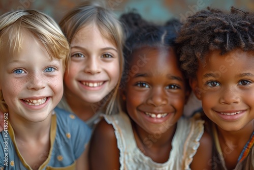 a group of young children, boys and girls, of different races, smiling