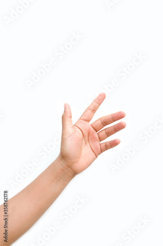 a hand holding something like a bottle or smartphone on white backgrounds, isolated
