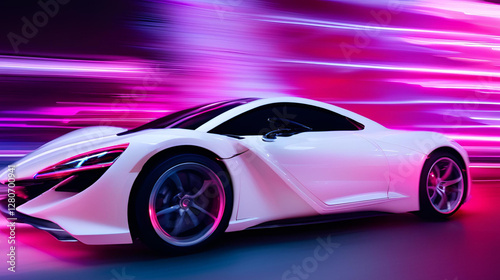 A high-speed white sports car is captured on a striking white background with motion blur effects, symbolizing speed and luxury