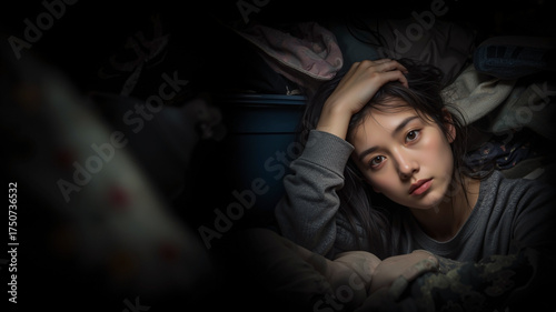 hopeless, teenage, sorrowful, portrait, asian, girl, sad, depression, emotional, lonely, bed, bedchamber, female, young, person, face, beautiful, isolation, despair, weary, sleepy, lazy, lost, melancholy, moody, lying, resting, thinking, indoor, home, room, dark, pillow, low key, lighting, shadow, photorealistic, realistic, closeup, dramatic, lifestyle, problem, alone, emotion, feeling, mood, quiet