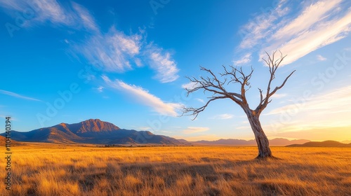 a lone tree in the middle of a grassy field with mountains in the background The sky is filled with clouds and the sun is setting, casting a warm orange glow over