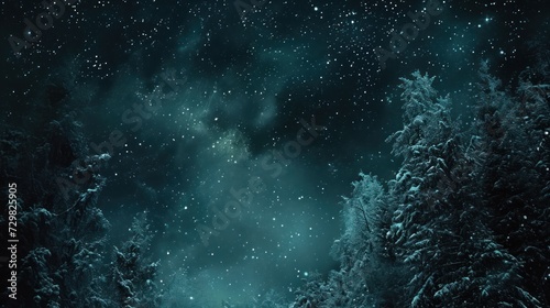 a night sky filled with lots of stars and a lot of trees in the foreground with snow on the ground and stars in the middle of the night sky.