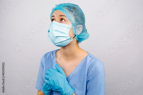 A nurse in medical uniform prays for health with tired eyes looking up. Emotional stress during a coronavirus outbreak.