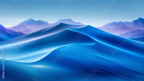 A painting of a mountain range with a blue wave in the foreground and a blue sky behind, featuring mountains in the distance