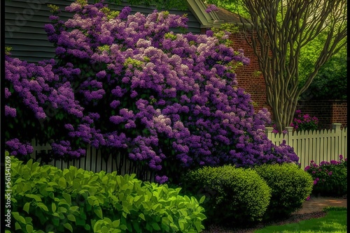 a painting of a purple bush in front of a house with a white picket fence and a white picket fence with a white picket fence and a white picket fence and a white picket fence.