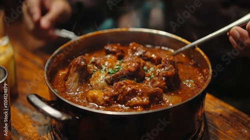 a person holding a spoon over a pot of food on top of a wooden table The pot is filled with a stew and there is a glass beside it The background is slightly blurr