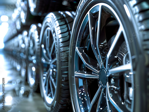 A photo showcasing new, sleek car tires designed for winter season, highlighting their durable treads and advanced grip for snowy conditions.