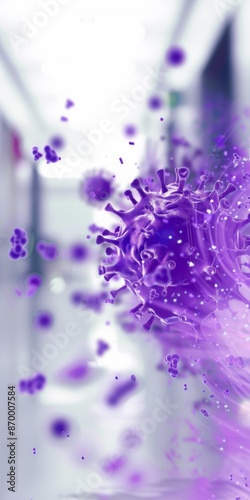 A purple virus disintegrating, white background, blurred hospital in the backgrounnd, realistic style, depth of field effect, macro photography, product shooting, closeup shot, bright light and shado